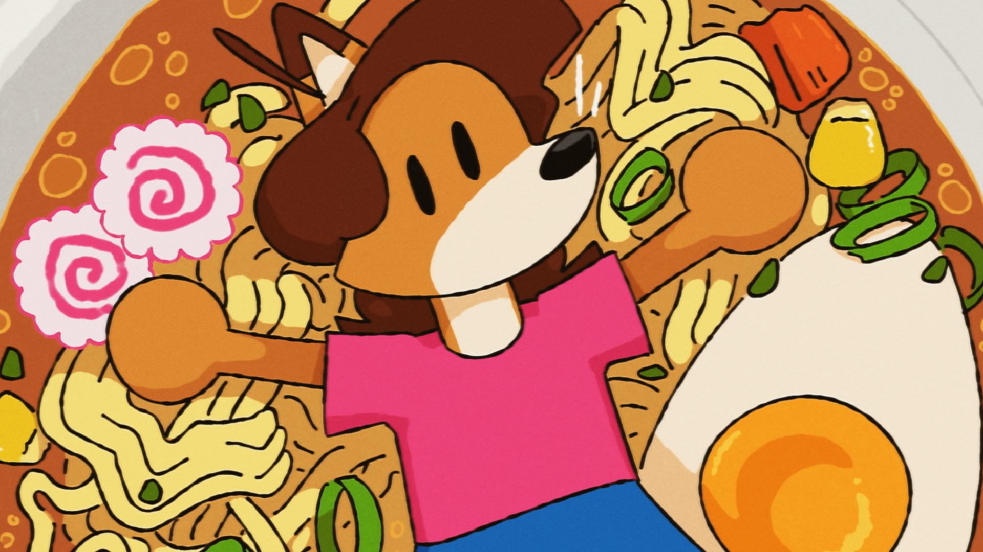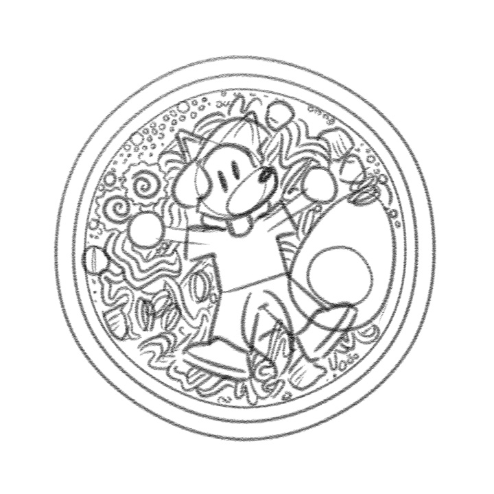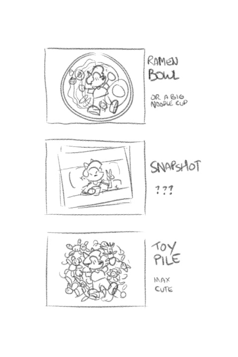 This is the closing frame from my little animation test, “Groovy!” The goal was to end the short with a still frame befitting of a cute classic anime, while capturing some of his dork energy in the process. I thumbnailed a few ideas, including a handful of photos and a pile of plush toys, but Lollie in a bowl of ramen seemed too good to pass up.