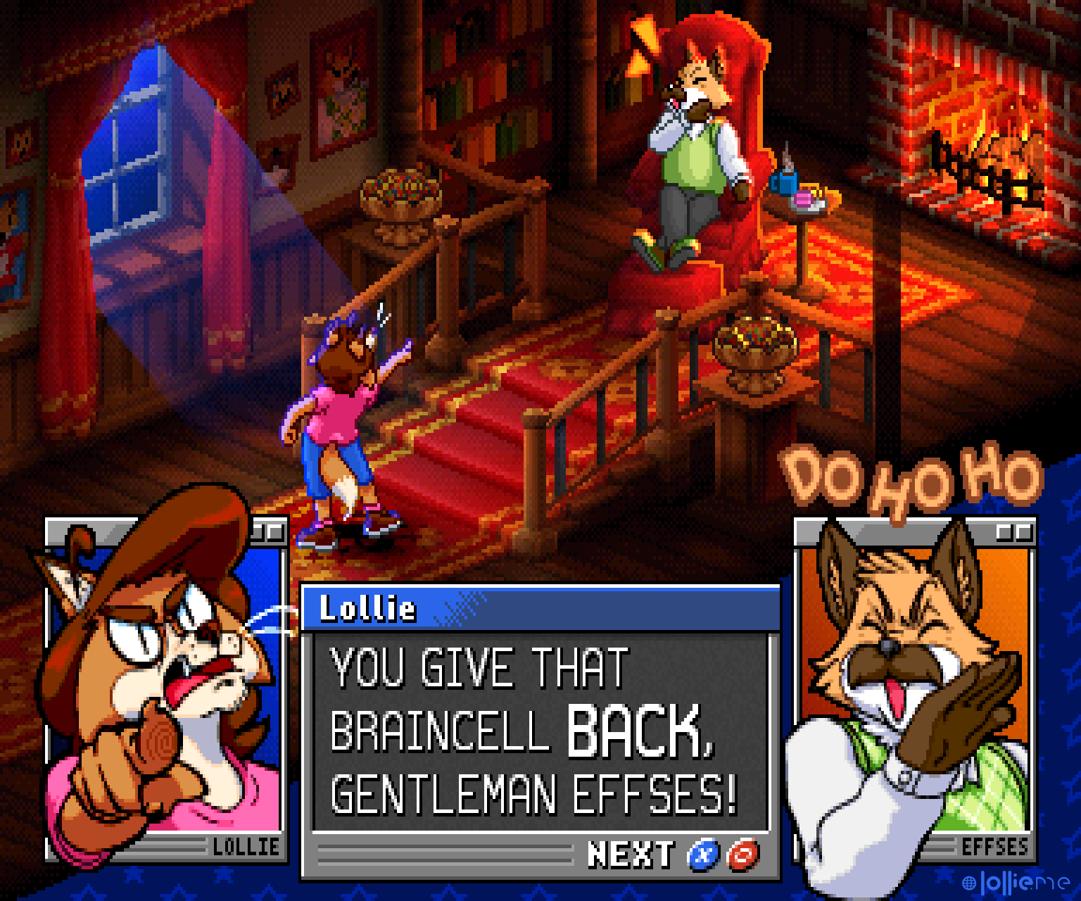 In August 2024, as part of a push to produce more pixel art and low-poly pieces, I whipped up a handful of sketches in the style of fantasy game screenshots. One of these sketches was a follow-up to 2023's pixel art piece, "Fussy Ambassador Lollie". This was also an opportunity to accost my friend Effses with long-overdue gift art.