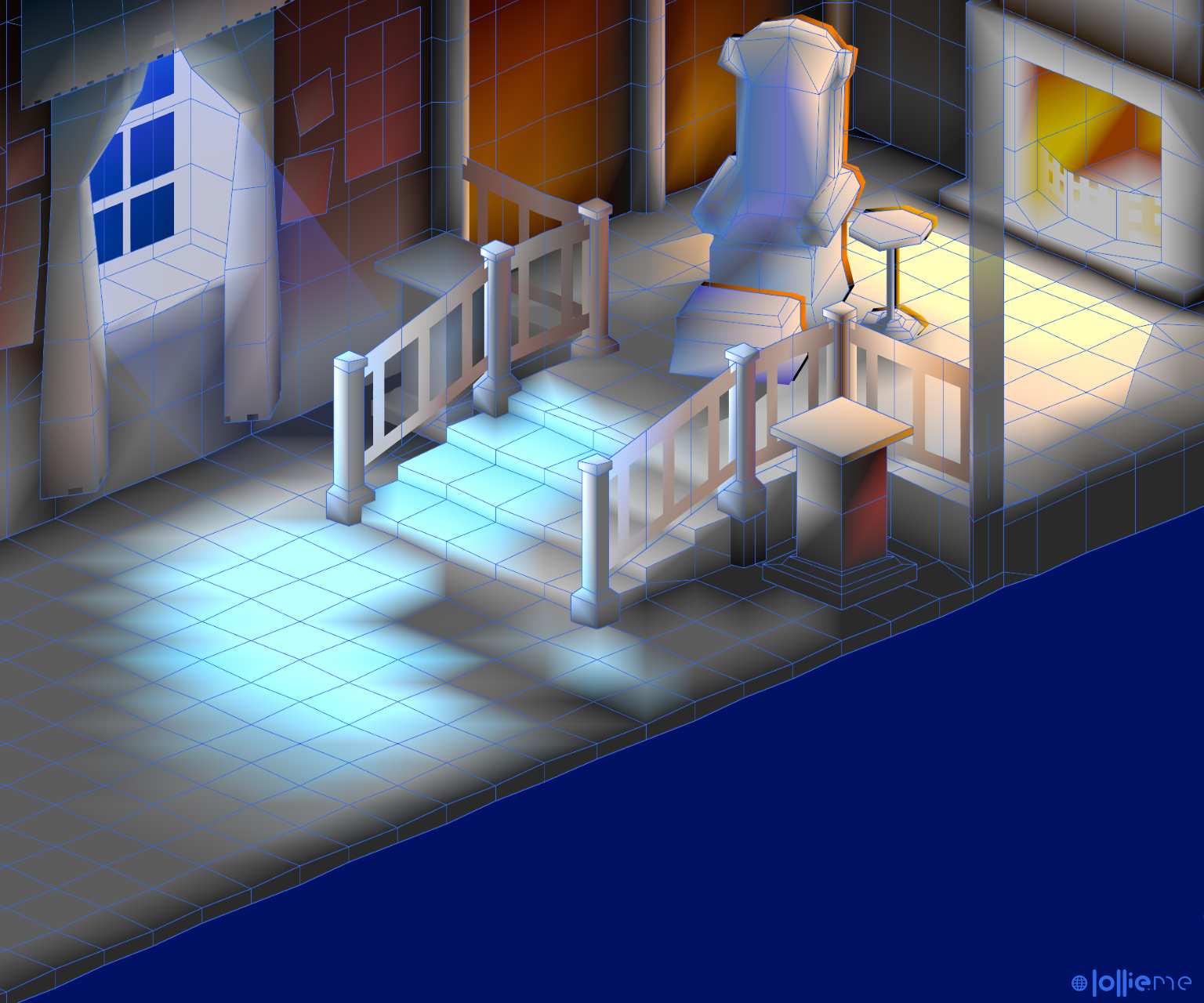 Using an orthographic view allowed me to leverage perspective tricks in the textures, while the lighting, shading, and alpha effects were all achieved with vertex colors.